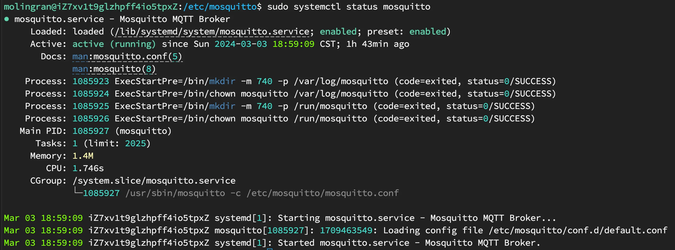 查看 moqsuitto 状态,检查安装是否成功