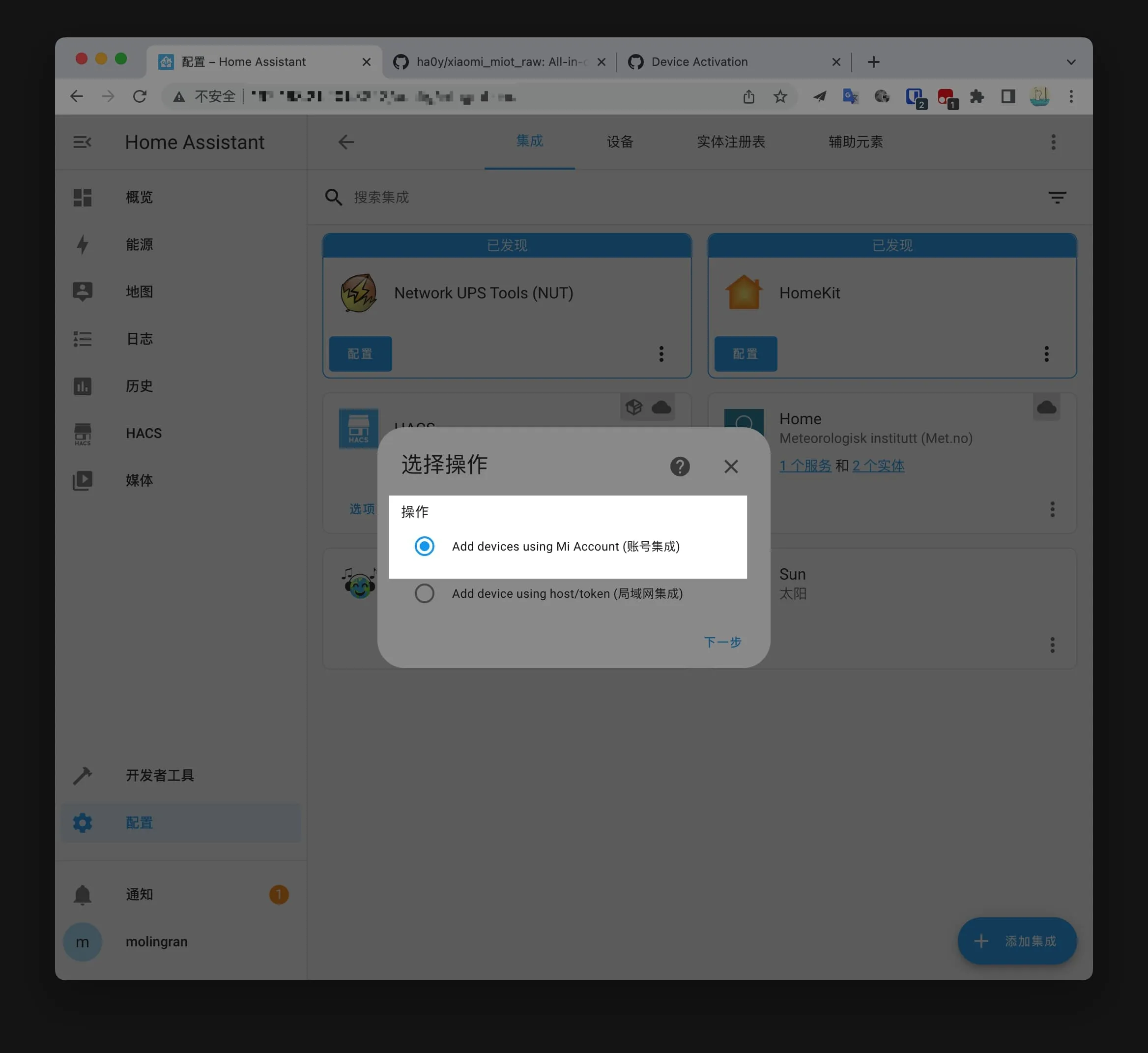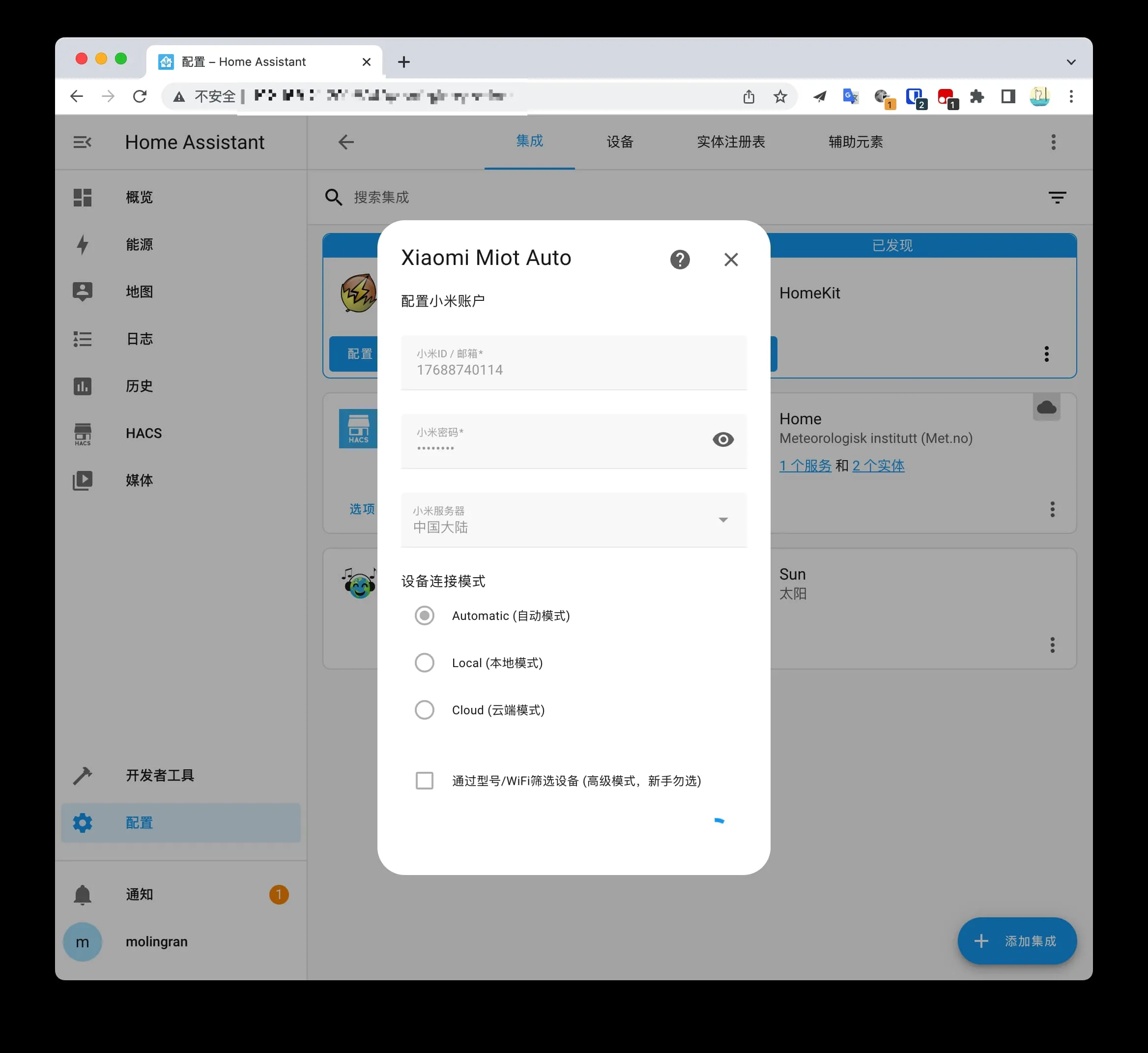 回到之前添加 HACS 的界面,这次添加 Xiaomi Miot Auto 集成了。选择账号集成。