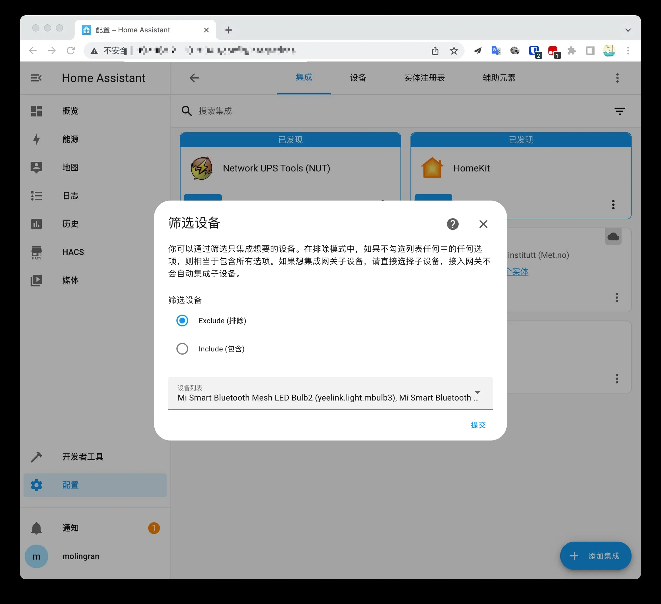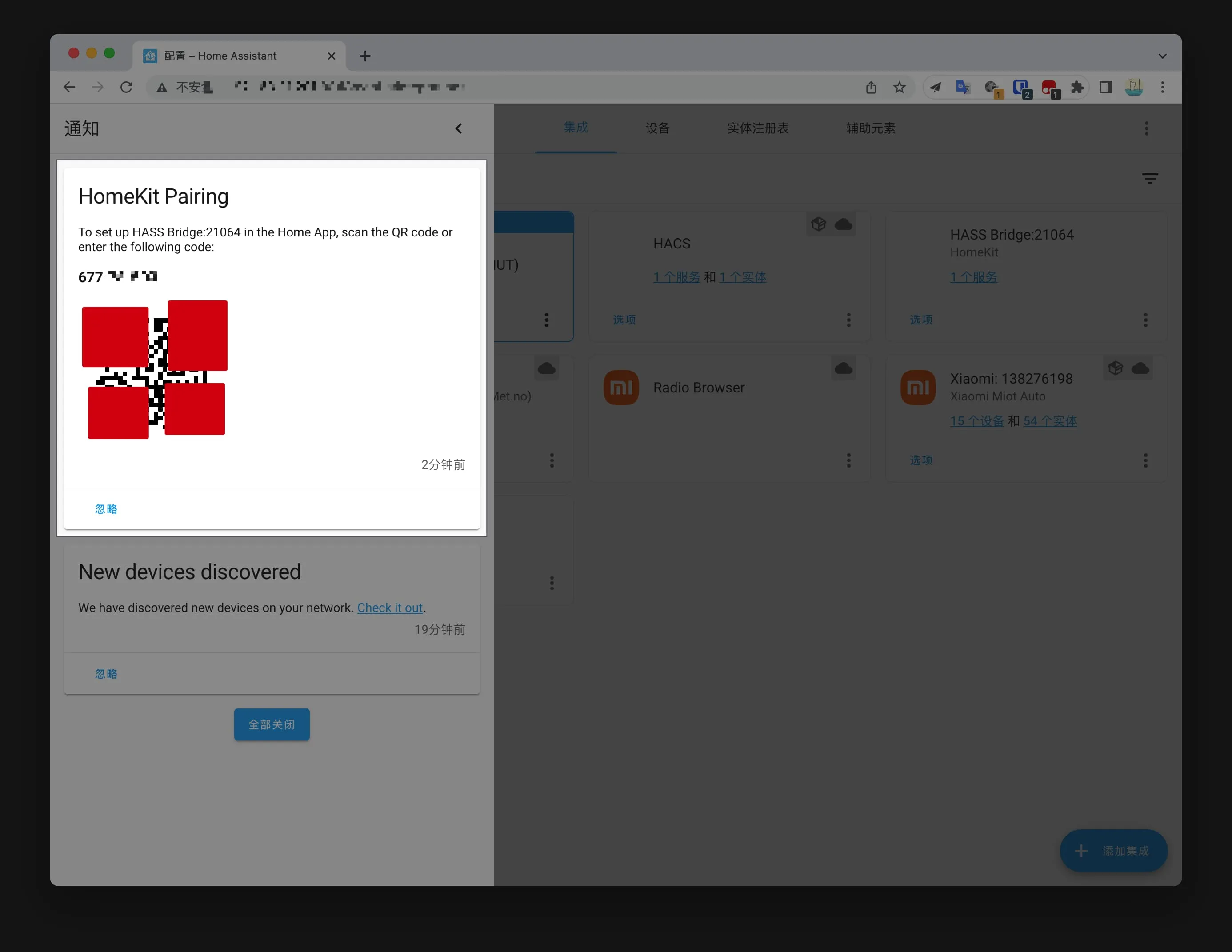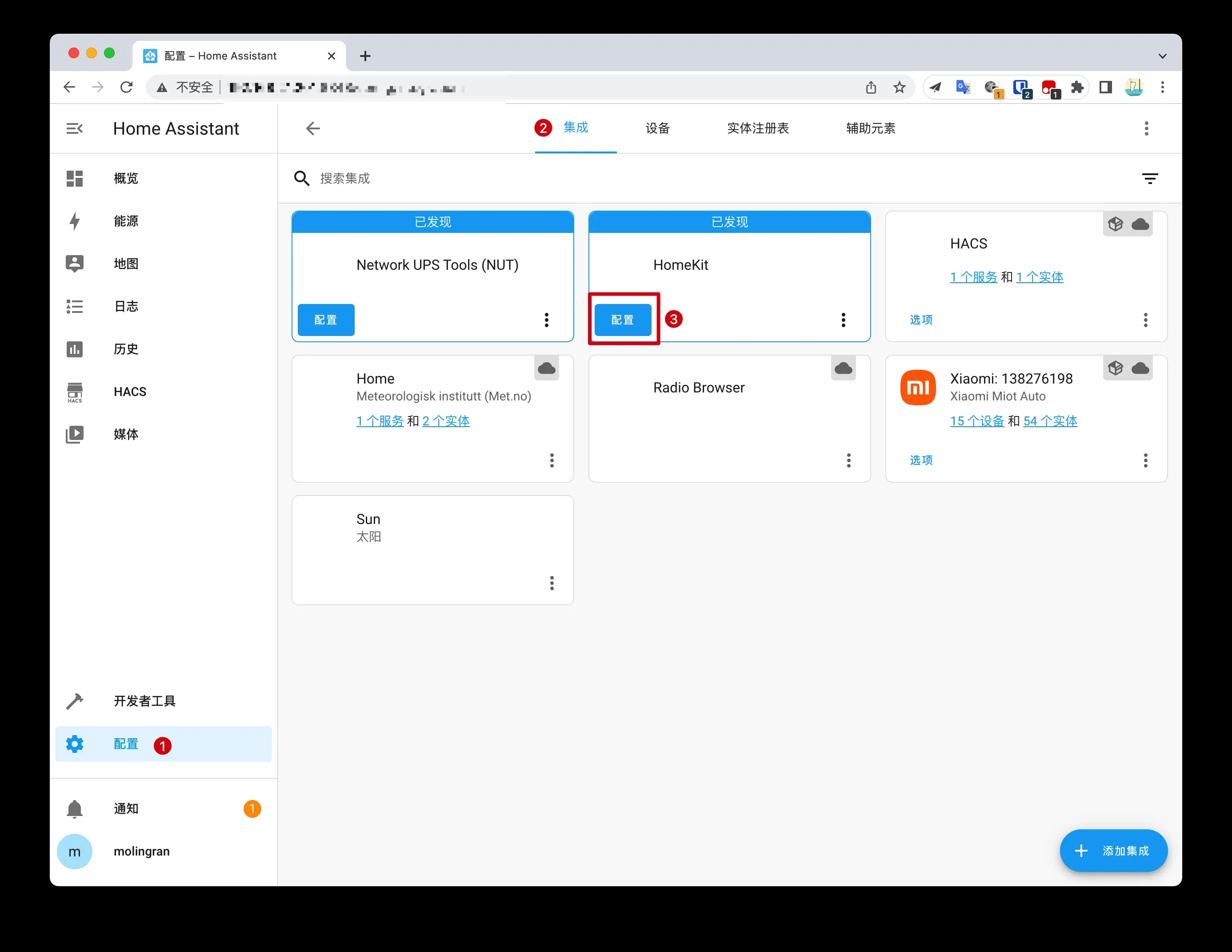HomeKit 集成就简单了,回到添加 HACS 与 Miot Auto 的界面。点击 HomeKit 的配置。