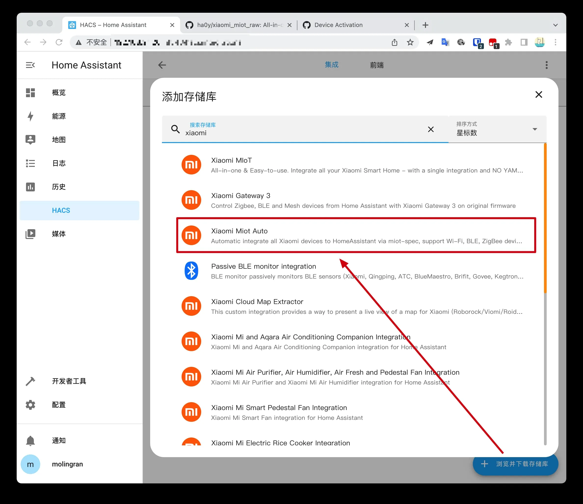 点击左侧菜单的 HACS->集成->浏览并下载存储库,选择 Xiaomi Miot Auto,点击右下角的下载->下载。