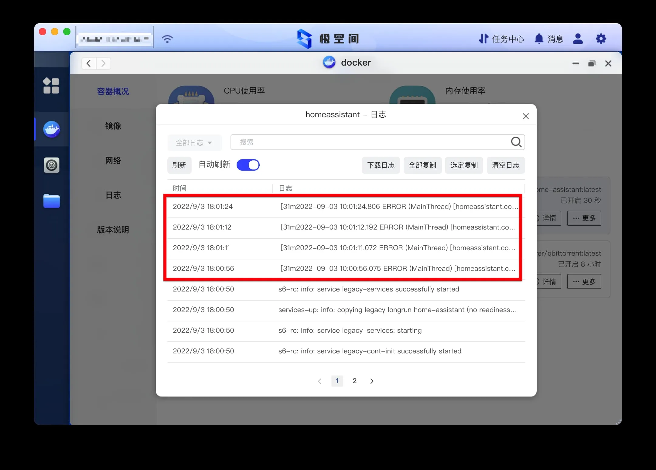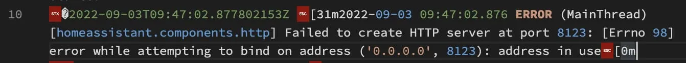 重启容器之后,如果无法用 http://{nas的IP}:{你设置的端口} 打开的话。建议复制日志,检查是否出现端口冲突错误。错误关键字如下,其中 8123 就是冲突的端口号