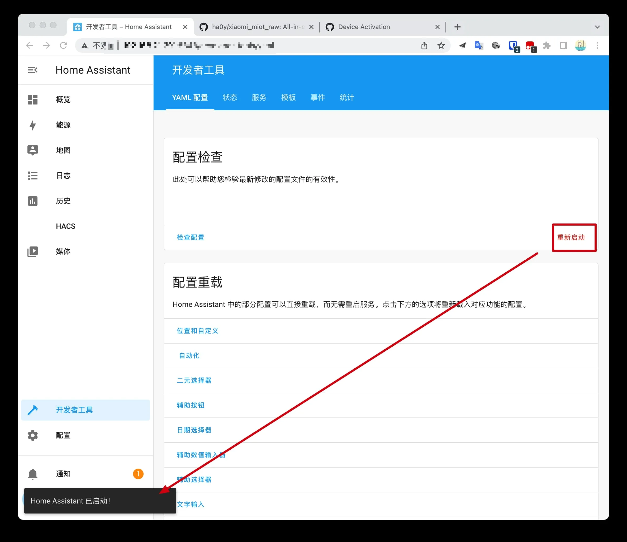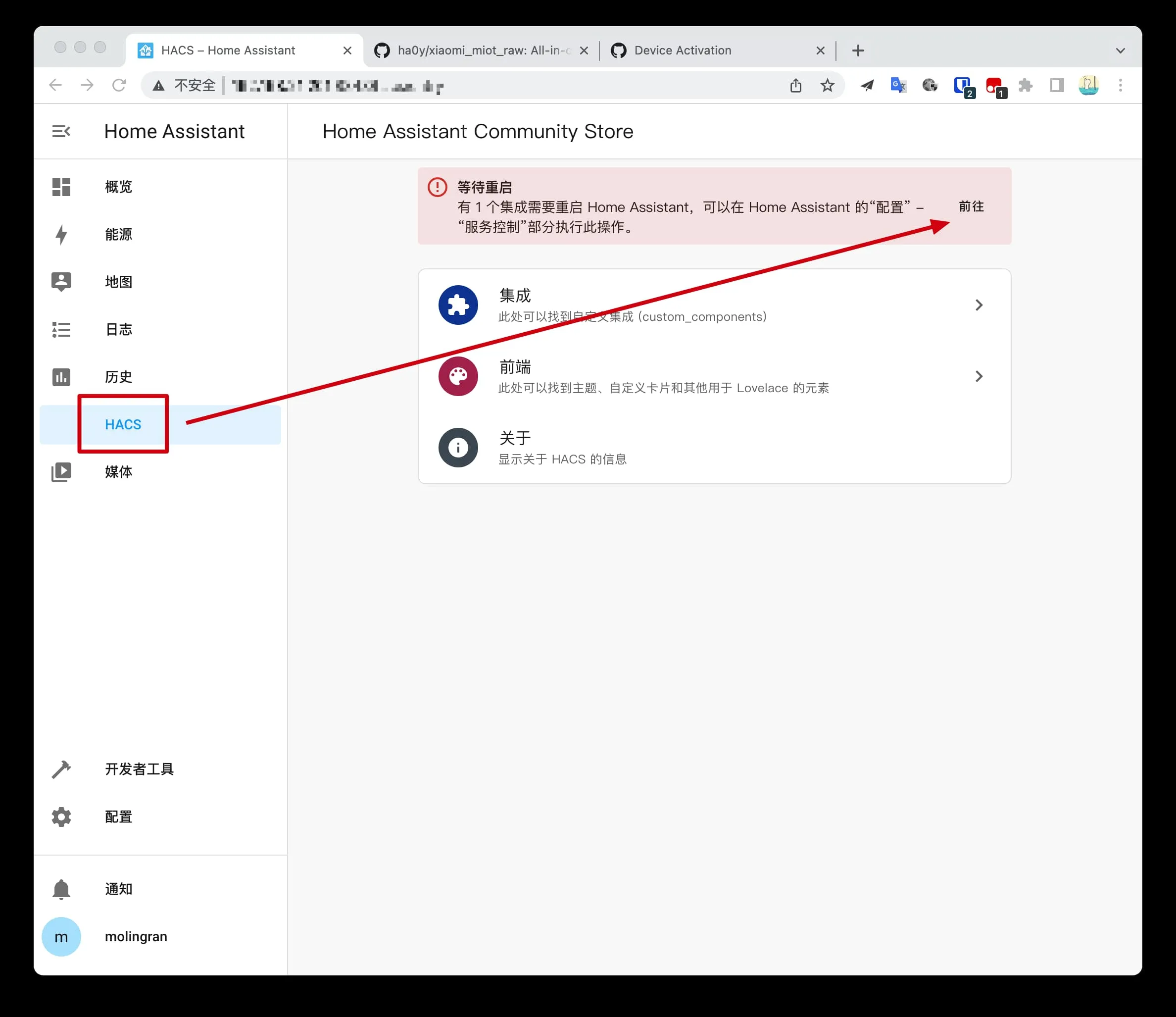 安装完成后点击左侧菜单的 HACS,点击等待重启中的前往