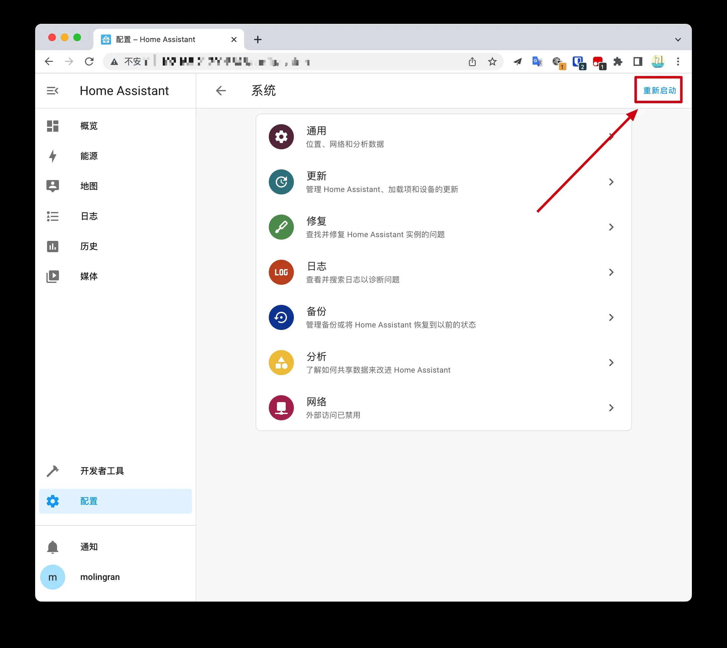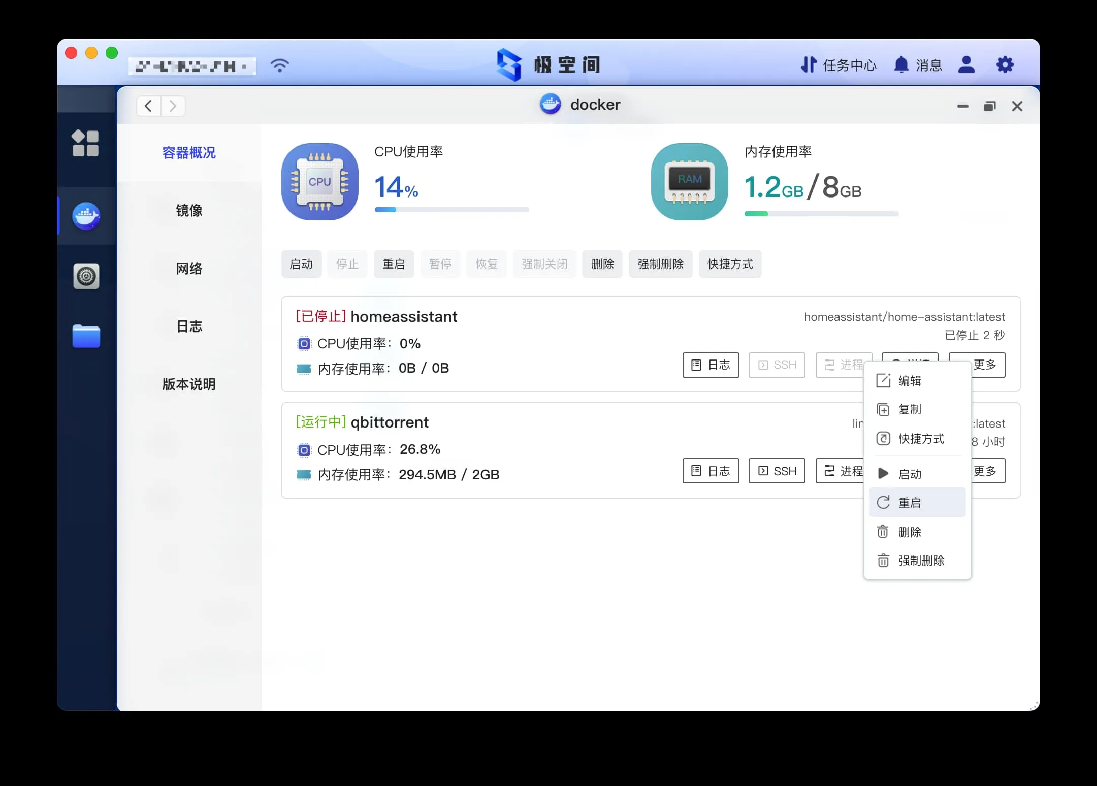 点击容器概况->home assistant 容器的 更多->重启,对容器进行重启。