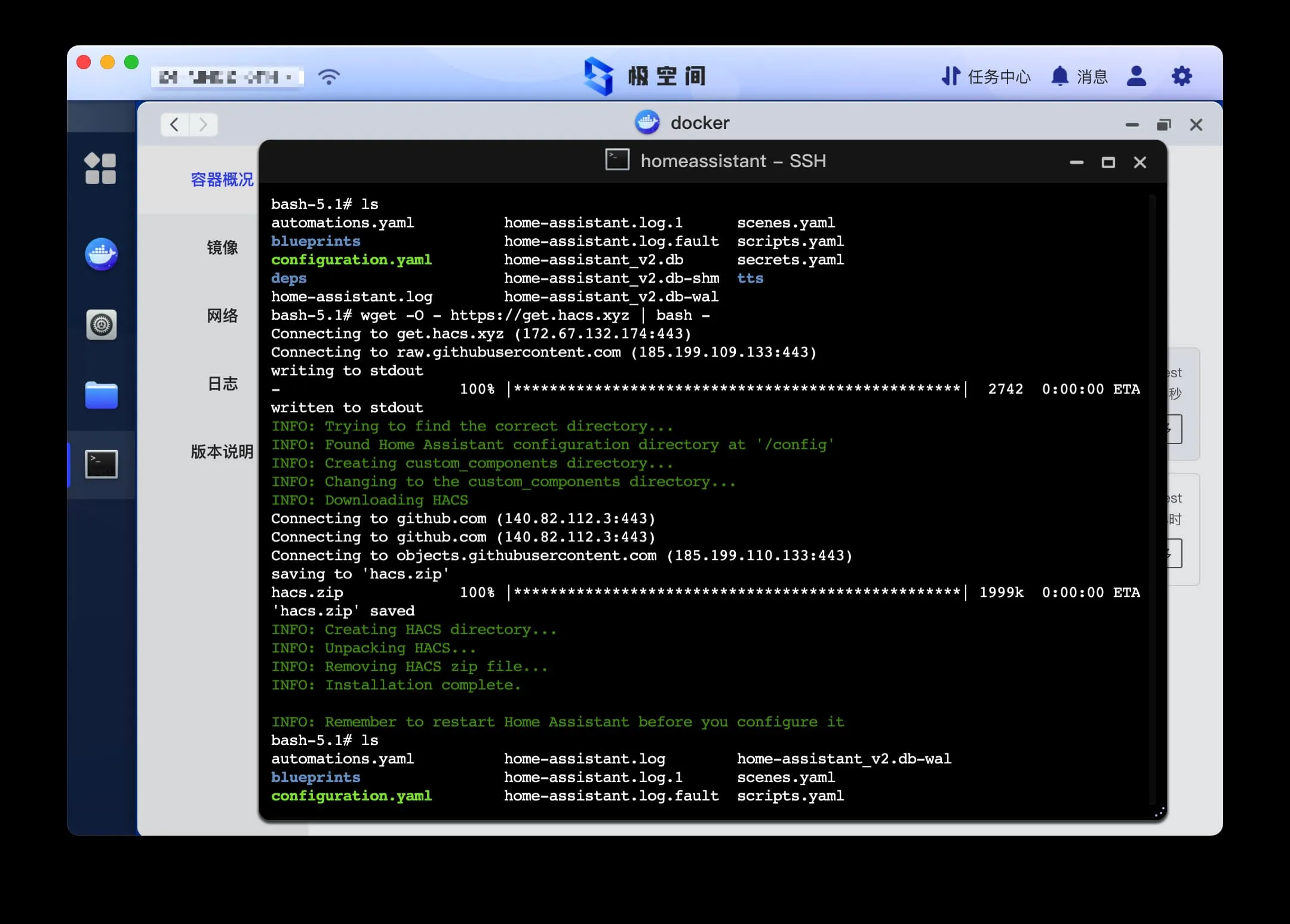 如果 Nas 访问 GitHub 通畅的话,直接使用官网提供的 HACS 安装脚本,使用 SSH 安装即可。
