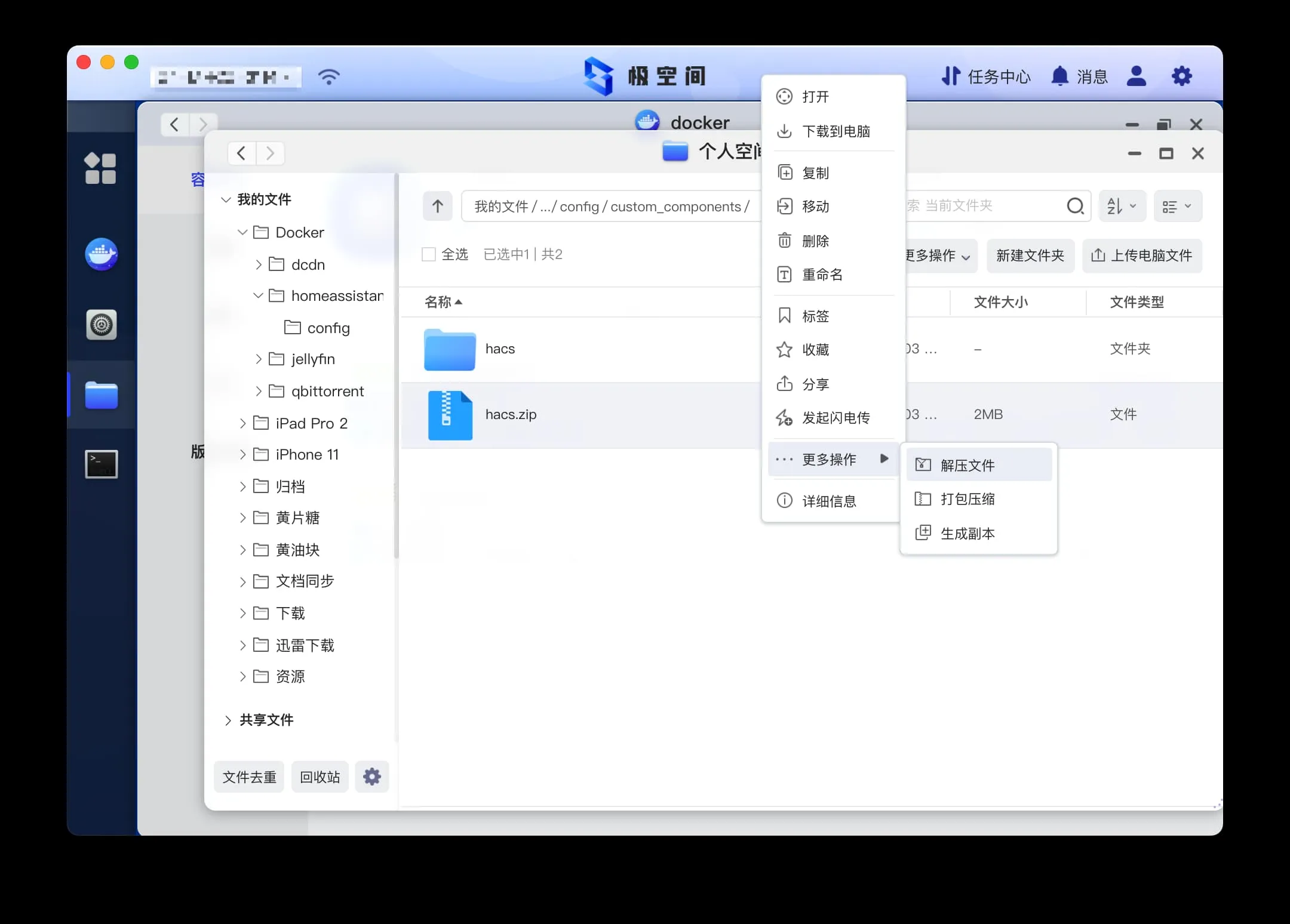下载完成后,在 Docker 的文件中新增 custom_components 文件夹。将下载的 hacs 安装包重命名为 hacs 注意后缀名是否正确,上传至 custom_components 文件夹,解压。